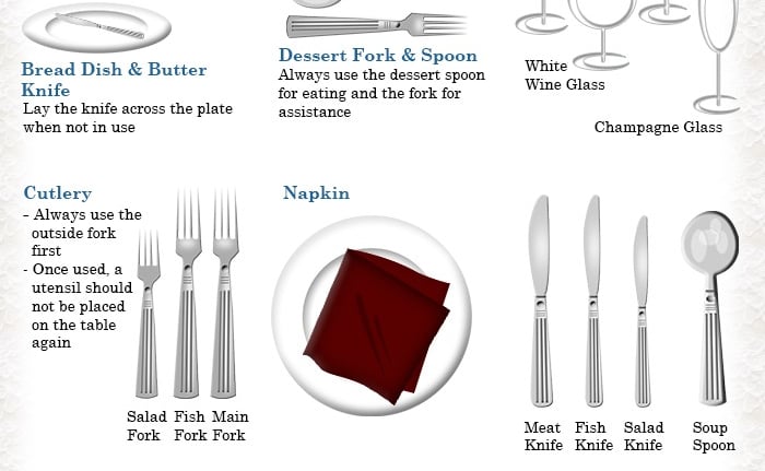 Proper table manners, utensil use, and dining conduct for formal and informal occasions.